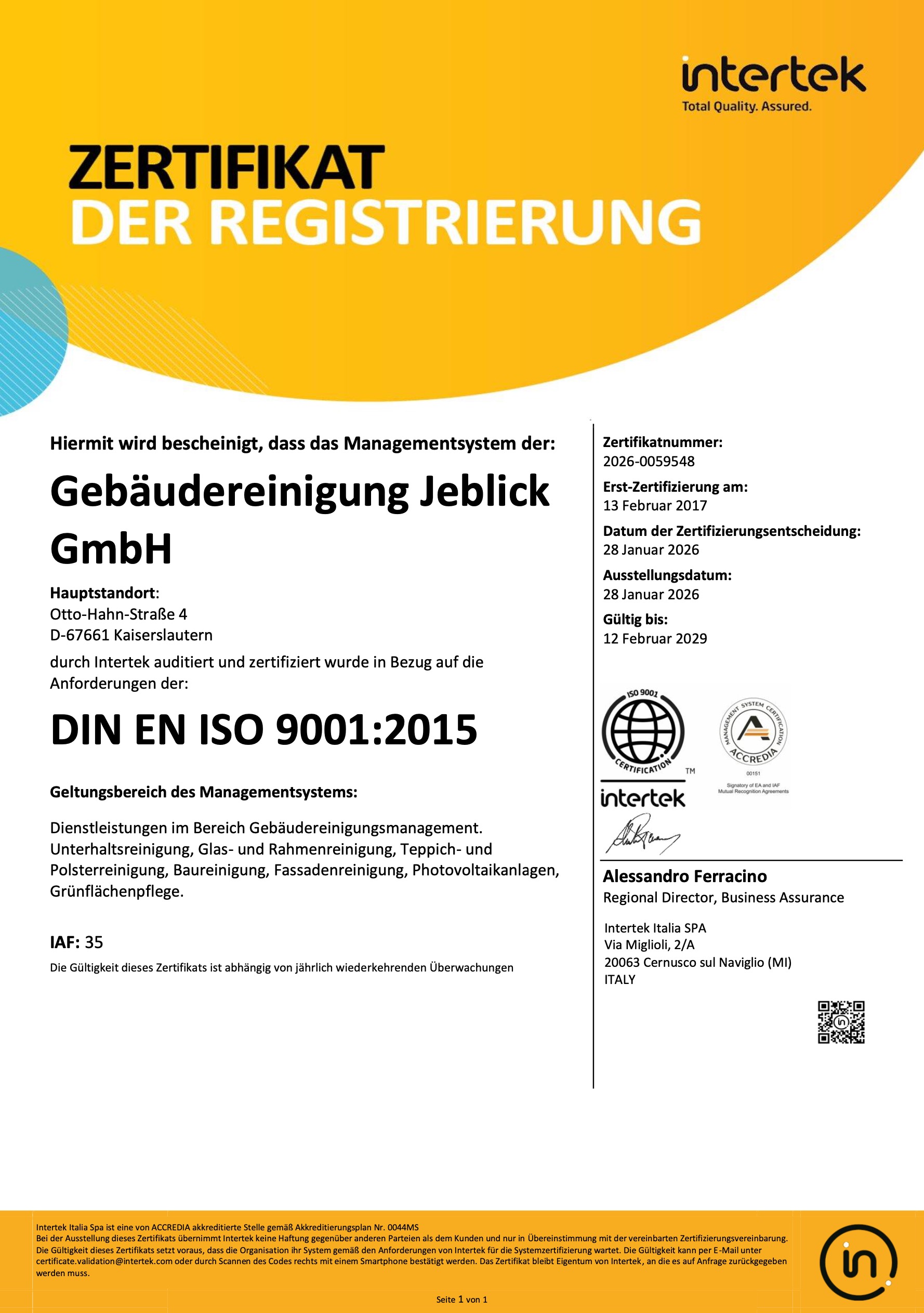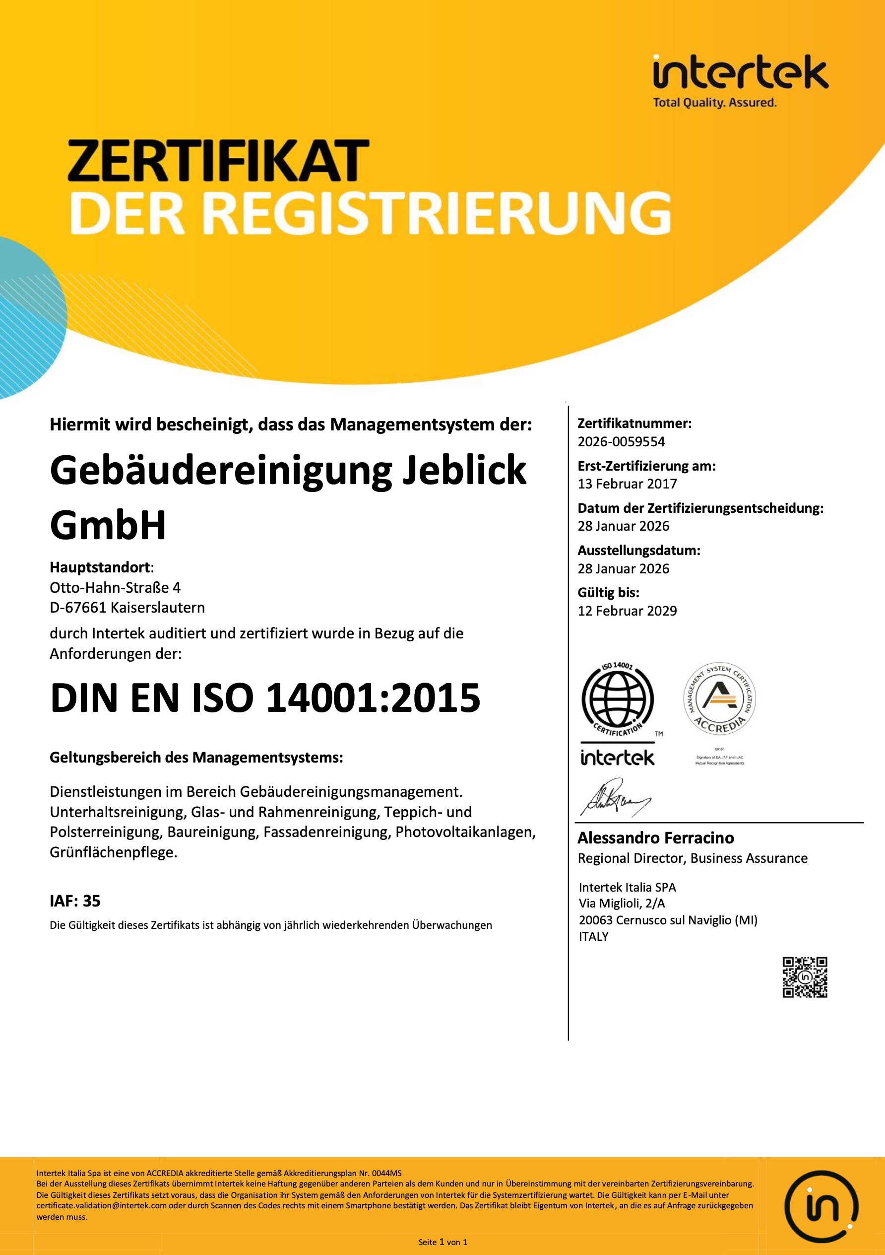 Nach umfangreicher Vorbereitung erfolgte im Februar 2017 das Audit zur Zertifizierung nach DIN EN ISO. Unseren Dienstleistungen im Bereich des Gebäudereinigungsmanagement wurden hierbei, ohne Abweichungen, die notwendigen Vorraussetzungen bescheinigt. Damit ist die Gebäudereinigung Jeblick GmbH seit 13. Februar 2017 nach DIN EN ISO 9001:2015 und DIN EN ISO 14001:2015 zertifiziert.